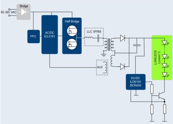 LED控制器ICL5101設計用於控制諧振轉換器拓撲,如LLC。集成數字PFC級在臨界傳導模式(CrCM)和不連續傳導模式(DCM)下運行,這允許在低負載條件下的非常穩定的調節,例如發生當設備變暗時。 LED照明可以在其額定負載的100%至0.1%的極寬範圍內變暗。目前最先進的調光範圍通常從100%到5%不等。此外,ICL5101可以在任何情況下提供超快的照明時間 - 小於200毫秒。