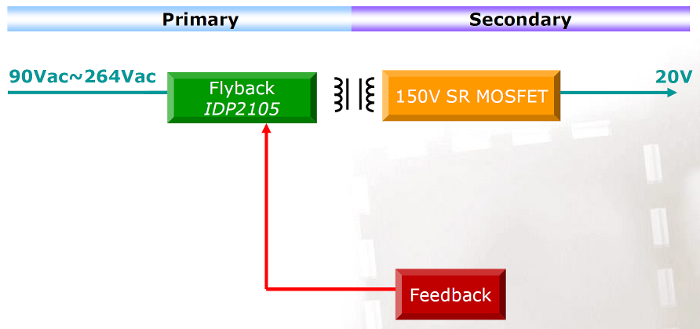 1.IDP2105為multi-mode flyback操作模式,可隨負載變化達到高效率的需求 2.ZVS專利控制技術可進一步減少電路損耗 3.搭配數位控制介面達到參數設定