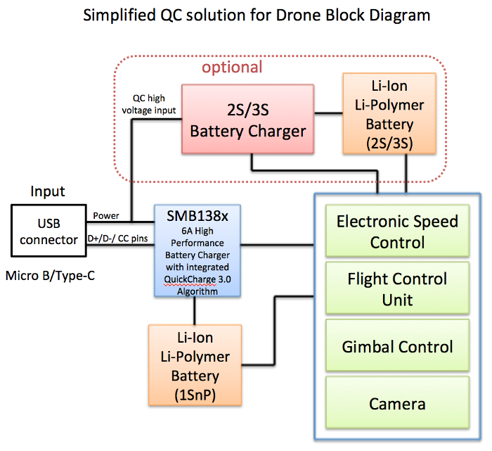 無人機的應用廣泛,讓無人機的市場持續擴大。在消費型無人機應用,大致分為較高端的攝影用與低端玩具類型。從消費者回饋訊息得知,以目前的設計而言,普遍存在續航力欠佳的情況。在不大幅增加材料成本的設計下,經由快速充電而達到短時間內再次使用,是一個良好的解決方案。高通的QuickCharge 快充方案可以建置於無人機內,或電池專用充電座,讓產品優勢提升。也讓充電方式與一般消費性產品共用性更高,帶來更便利的使用環境。