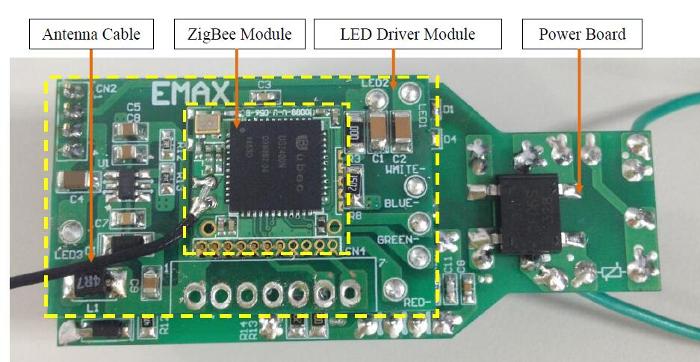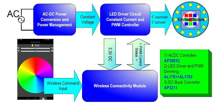 本方案主要應用于智慧家居燈光智慧調節,該方案採用通過無線模組與手機聯接(本方案採用ZigBee+Wifi Hub)來實現控制多通路LED驅動拓撲結構(R,G,B)