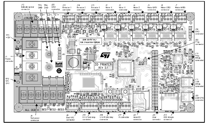 STEVAL-3DP001V1允許通過提供驅動電源(5 V - 3.3 V)和數字接口(SPI-I2C-ADC-GPIOS-SD-USB)的連接器連接到另一塊電路板(例如樹莓板或用戶板)。