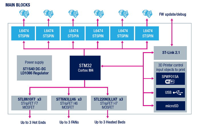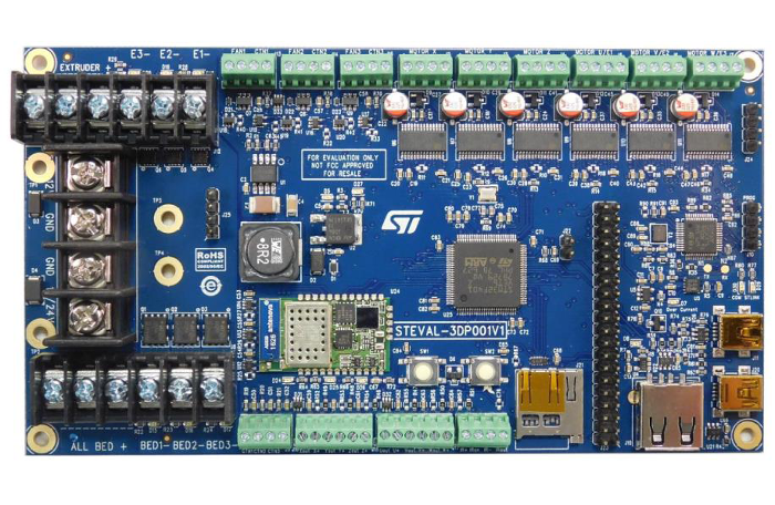 STEVAL-3DP001V1是用於驅動市場上所有3D打印機的完整集成解決方案,包括需要更複雜計算的Delta模型。該解決方案非常適合初學者和有經驗的用戶。由於採用基於ARM 32位Cortex M4內核的嵌入式STM32微控制器,因此它是獨立的,可以與軟件接口或定制固件一起使用。 STEVAL-3DP001V1設計用於驅動提供多個軸(6台電機),多台擠出機(1至3台)和多區加熱床(1至3台)的3D打印機。