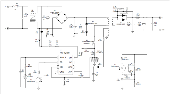 世平集團推出的65W 高效小型化AC-DC解決方案,是採用安森美(ON Semi) 半導體新一代定頻高效能NCP12400 反馳式( Fly-back)PWM IC. 此一IC採用電流模式操作,加上內建高壓啟動電路與X2電容放電迴路,適用於20W~65W電源適配器(Adapter) 與系統輔助電源的應用。
