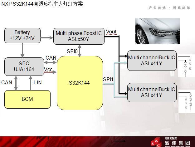 S32K144 1)S32K符合AEC-Q100規範。 2)內部集成32位Arm® Cortex®-M4F和Cortex-M0+雙核。 3)集成CAN FD介面。 4)安全支援CSEc硬體安全、ASIL-B ISO26262功能安全和超低功耗性能。 5)免費的量產級軟體發展套件(SDK)和S32 Design Studio IDE。 6)支持AUTOSAR和MCAL,協力廠商生態合作體系。 升降壓晶片ASL4500HN+ASL3416SHN 1)ASL3416SHN支持3通道BUCK LED驅動器,支援SPI介面對晶片進行配置,具有輸入輸出電壓監測和UV保護,集成bootstrap二極體,低EME和高的EMI特性,小於5uA的極低的靜態電流@25℃,支援AEC-Q100 Grade 1認證。溫度範圍在-40℃-+125℃。 2)ASL4500HN支援4相Boost轉換器,支援5.5V到40V的寬壓輸入,通過SPI介面可配置輸出電壓,快速高效場效應管開關,輸出電壓監測以及電源測量,通過SPI可讀取變成電壓和頻率,低EME和高的EMI特性,小於5uA的極低的靜態電流@25℃,支援AEC-Q100 Grade 1認證。溫度範圍在-40℃-+125℃。 MatrixLED控制ASL5XXSHN 1)12 switches, 4 floating blocks of 3 switches (12 single LEDs or segments) 2) 每路開關最多支援1.5A驅動能力 (in parallel up to 6A) – ASL5x15SHN 3)每路開關最多支援0.8A驅動能力(in parallel up to 3.2A) – ASL5x08SHN 4)12位解析度@244Hz/488Hz(可到達平滑的調光效果)。 5)PWM的相位差可以避免開關產生的峰值電流。 6)通過旁路特性可以檢測和診斷LED的開關特性。 7)直接NTC和PCB併入電阻器輸入。 8)支援 CAN (FD) 介面與主控進行通訊。 9)內部集成200MHz振盪器。 10)5 位址線 – 可連接32個32 MLCs,總共可以驅動384 LEDs。 11)5V供電時,功耗小於 10mA。