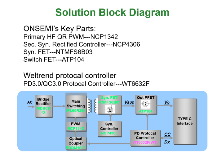 該設計採用了安森美 NCP1342 HF PWM控制器、NCP4306同步整流控制器和WelTrend的WT6632F PD3.0協議控制器,具有緊湊的外形和高的功率密度,該設計支援C型介面PD3.0和QC3.0A類快速充電協定。此方案提供USB TYPE C PD快充功能: 5V/3A, 9V/3A, 15V/3A, 20V/2.25A同步整流控制晶片NCP4306,USB-PD 控制晶片WT6632F.待機功耗僅為30mW。滿載的時候效率可達91%之高。輸出功能具有OVP,UVP,OCP等過壓,過流等保護。可實現整個系統的穩定。由於頻率可以做到110KHZ,比傳統的Apdater的體積可做的更小。
