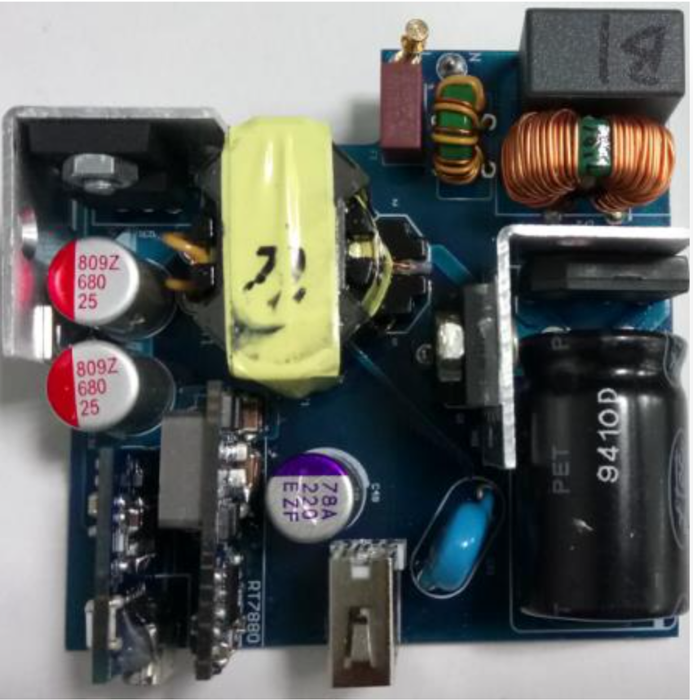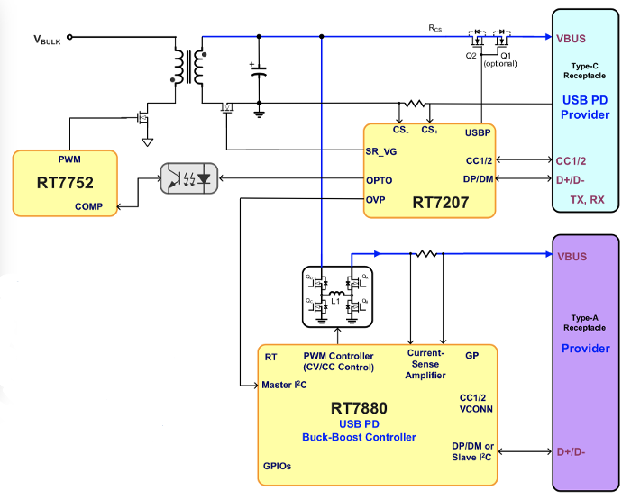 立錡推出的RT7752+RT7207K+RT7880組合。RT7752是PWM控制器,RT7207K是帶有同步整流控制的 USB PD電源控制器,RT7880是含有Buck-Boost控制器的USB Type-C埠控制器,同時支援PD協定。我們用這個組合構成了一個含有USB Type-C介面和USB Type-A介面的48W 雙口充電器,C口在單獨使用時能輸出45W功率,輸出電壓可在3.3V-16V(或 5V-21V)之間調節(級差為20mV),輸出電流的限制誤差可以精確到±150mA,完全符合PPS可程式設計電源規格。A口也接入負載時,C型介面的最大輸出功率下降到30W,在滿足筆記型電腦基本需求的同時也滿足另一個負載如手機的需求,同時確保總的輸出不會超過充電器的功率限制,不致造成充電器的過熱損壞。A型介面的輸出也是智慧化的,它可以根據負載的需要調整電壓和電流限制,滿足諸如手機快充等各種需求。
