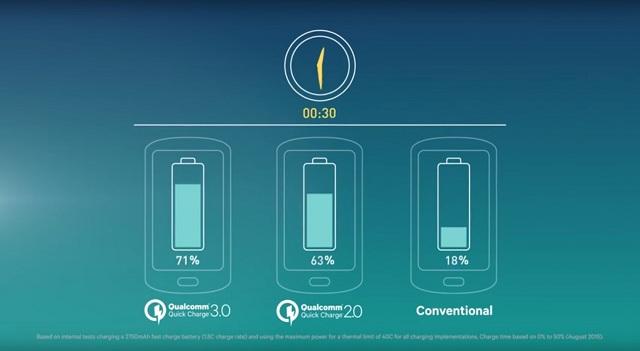 智慧手機的電池容量愈來愈大,除了省電能力外,充電速度更成為使用者愈來愈重視的特點。高通(Qualcomm)的 Quick Charge 快充技術已成為業界的典範之一, Quick Charge 3.0 技術(簡稱 QC3.0),一般手機只需充電約 35 分鐘,電量即可從 0% 增至 80%;而沒有使用 Quick Charge 技術的傳統行動裝置,則可能需花費約 1.5 小時的時間。QC3.0 可向下相容於先前的 Quick Charge 版本,並且可支援最新的 USB Type-C 接頭;它在充電選擇上面更具彈性,QC2.0 提供了 5V / 9V / 12V / 20V 四種電壓選擇,而 QC3.0 則以每 200mV 為增量,於 3.6V 至 20V 的電壓範圍內,提供不同電壓的彈性選擇。這讓手機選擇最適合的電壓達到理想充電電流,進而將電能損耗最小化、提升充電效率並改善熱表現。