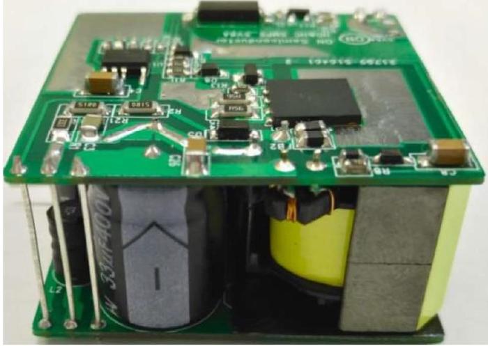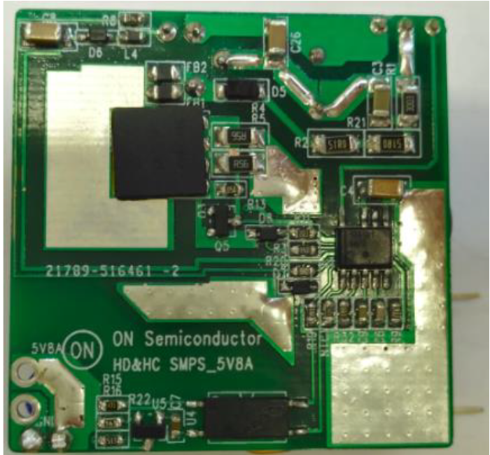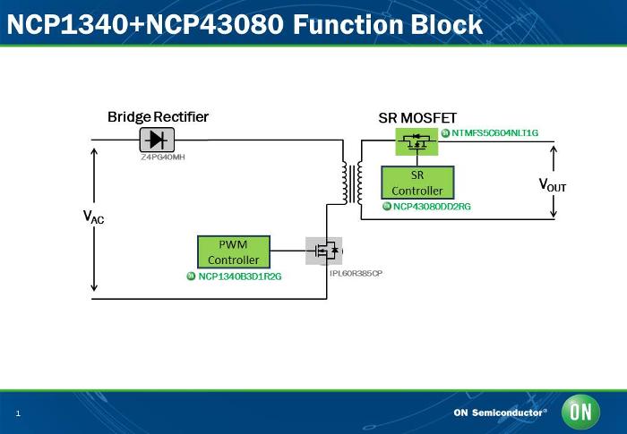 本案採用ON Semiconductor NCP1340+NCP43080的解決方案,以達到高效率、低待機功耗與完整保護要求。NCP1340是高頻準諧振電流模式控制PWM IC,它集成X2電容放電、谷底閉鎖、Quiet-Skip等新穎技術。並搭配NCP43080同步整流IC,NCP43080可應用於LLC、Forward或DCM/CRM/QR的Flyback,它集成二次側零電流偵測、輕載關閉模式、最大1MHz操作頻率與8A-Sink/4A-Source電流等新穎技術。