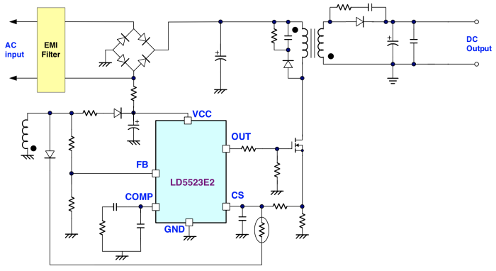 消費型適配器市場應用上,目前主要使用 SSR 架構應用在小於 45W 的適配器產品, PSR 架構大部分使用於小於18W功率的產品,通嘉新一代的 Flyback 產品導入PSR 架構於 LD5523E2,可有效減少原本 SSR 架構 BOM 上的元件數量,產品適用性也拉大到 45W 的應用,在小於 45W 適配器的成本上有更大的優勢。且LD5523E2 有優秀的混模技術QR+CCM,效率表現等同SSR;具有線補,可降低輸出DC 線號;低頻升壓機制,降低ripple,減少輸出入電容值;低待機功耗;頻率切換範圍加大,較佳的EMI 表現;支援BNI/BNO 功能;邏輯保護齊全,可靠性高。