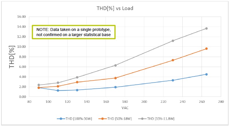 - 可以在滿負載時實現低於10%的輸入電流(THD)的總失真,並且在整個輸入電壓範圍內在30%負載時低於20%。