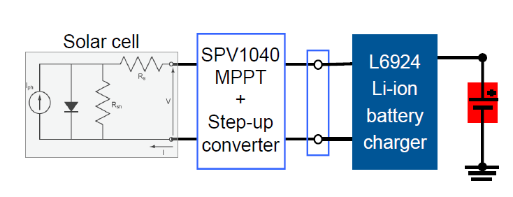 SPV1040:具有嵌入式最大功率點跟踪(MPPT)的太陽能升壓轉換器 專有的“擾動和觀察”MPPT算法 效率高達95% 極低的輸入電壓(低至0.3 V) 輸入反極性保護 熱關閉 過流保護 啟用引腳 L6924D:完全集成的線性充電器解決方案,具有功率MOSFET,反向阻斷二極管和電池熱控制 1%電池電壓調節精度 高達1 A的充電電流,精度為7% 用於輸出電流控制的閉環熱調節保護 電池漏電流低 嵌入式準脈衝充電模式可最大化太陽能電池板的充電速率 可選4.1 V和4.2 V輸出電壓 JEITA符合外部電路 可編程充電,快速充電(最高1 A),預充電,終止電流,預充電模式電壓閾值,充電定時器 多功能引腳,用於靈活的充電過程終止 狀態輸出用於驅動LED或主機處理器接口 電池缺失檢測 NTC或PTC熱敏電阻接口,用於電池溫度監控和保護 符合RoHS標準