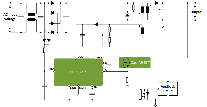 LED照明已經在商業照明與民用照明上廣泛應用。LED燈具的多樣性對LED驅動電源也同樣有多樣性的要求,不同的燈具亮度及光源燈珠個數的組合要求驅動電源規格亦有所不同。為讓LED驅動電源生產廠家可以快速地滿足終端應用不同的要求,英飛凌XDPTM數字電源系列晶片可以讓客戶在不用調整硬體基礎上通過電腦連接調整晶片內部參數來實現驅動電源不同輸出規格,大大縮短市場開發周期與減小庫存數量,使得經濟效益明顯體現。通常情況下,LED需要在恆流模式下才能安全運行,為提高照明燈具性能並避免閃爍,採用恆壓輸出架構搭配二次側DC/DC或LDO可以實現高性能的LED驅動器。此外多通道LED驅動也可以採用此種拓撲架構。LED照明同時要求高功率因數及低的THD. XDPL8219是一款恆壓輸出帶有高功率因數調整的單級反激式控制晶片,可以很好滿足上述照明方案的需求。