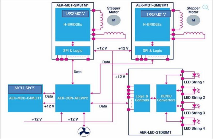 該方案(AEK-MOT-SM81M1)是應用於自適應頭燈的ST L99SM81V步進馬達驅動方案。