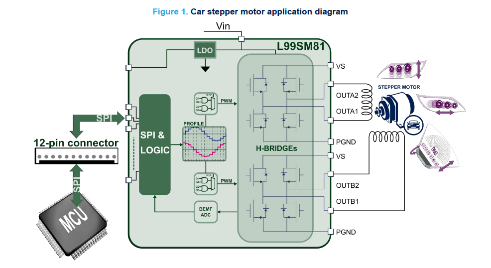 • L99SM81V驅動有管理計時器、計數器、參考表和模式或狀態寄存器,由外部微控制器讀取或設置以驅動雙極步進電機的兩個線圈,同時也可以單獨運行和保存配置用於移動轉子或保持它靜止。