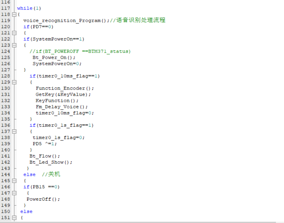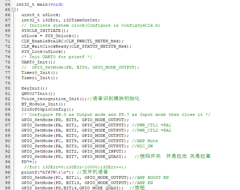 本方案是基於市場上常用的編譯工具Keil MDK開發的。程序上電進入PowerDown模式,等待撥碼開關打開或者通過G Sensor檢測到,汽車啟動,進入主循環等待語音識別命令和按鍵旋鈕操作。語音部分主要是藍牙模塊控制,ISD94124通過發送串口命令控制藍牙模塊發出響應音。其部分代碼如下。