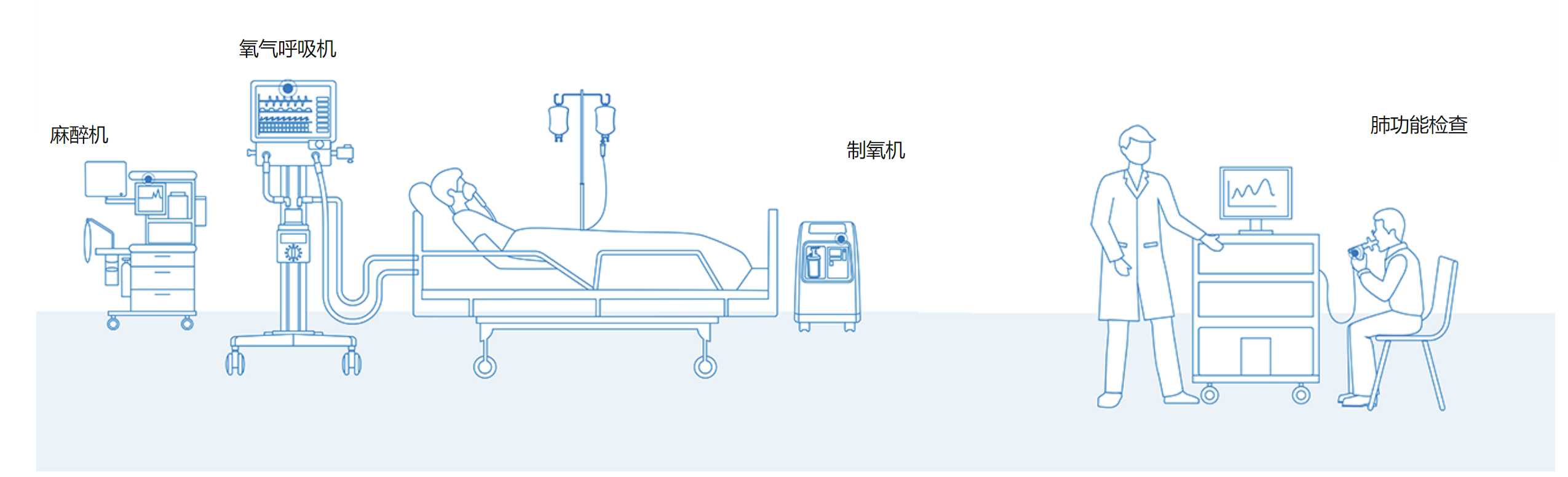 眾所周知,患者在治療過程中需要氧氣。一般醫院中“氧氣”是利用純醫療級別的氧氣和空氣加濕過濾混合。醫生會依據具體的治療需求,實時測量和監控患者吸入和呼出的氧氣濃度、流量、壓力、流速等。特殊情況下,患者需要100%濃度的純氧。因此,氧氣濃度和流量測量在不同的醫療器械和治療儀器中發揮著重要作用。