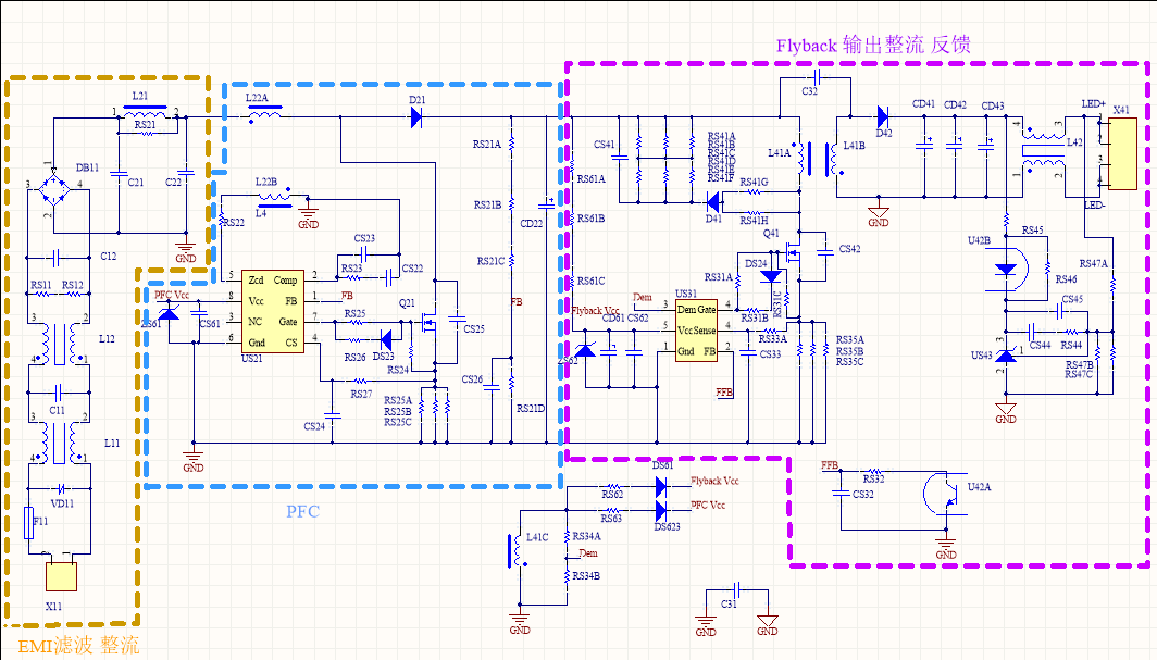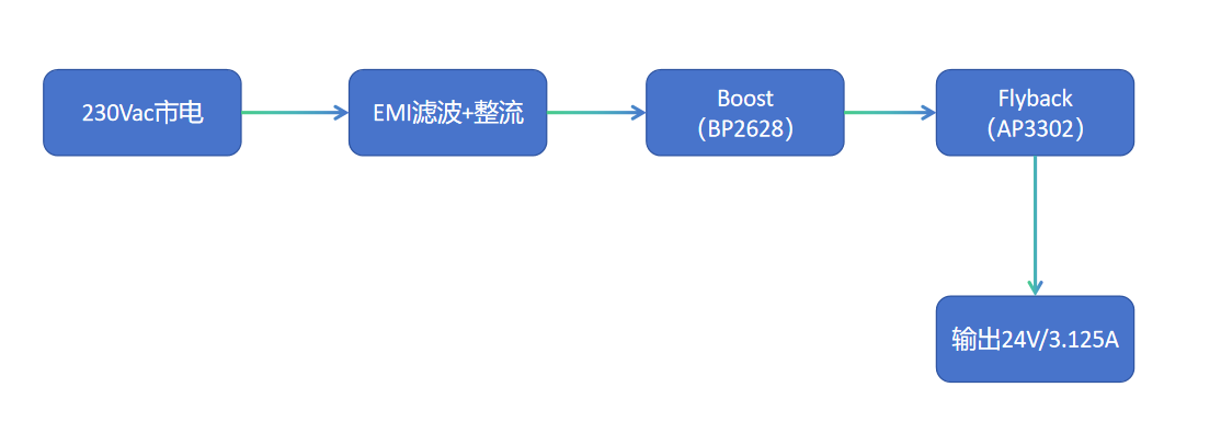 該75W的LED電源方案採用了兩級的架構,PFC部分採用BP2628,外圍對比ST的6562去掉了乘法腳,外圍簡單,且待機功耗優化。Flybakc部分採用Diodes的AP3302,也是一顆6pin的反激控制器晶片,外圍簡單,效率高,非常適合用於50W-100W恆壓電源方案的設計。