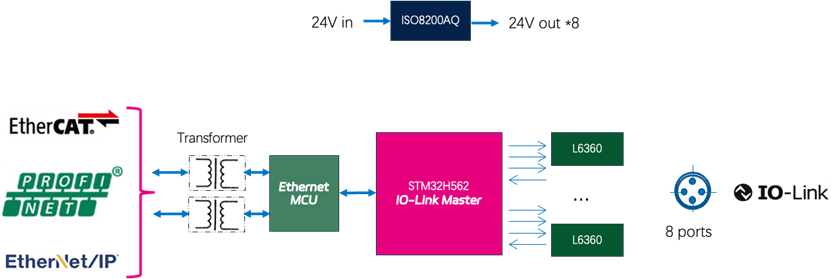 1、核心器件 採用STM32H562+8*L6360+ISO8200AQ 2、通信接口 協議版本: IO-Link V1.1.4 接口:Profinet、EtherCAT、Ethernet/IP 數字輸入端:16*PNP,可配置 數字輸出端:8*PNP 埠類型:Class A 3、電氣參數 工作電壓:18-30VDC 埠最大輸出電流:1.6A 總傳感器總電流US:16A 傳輸率: 10/100 Mbit/s