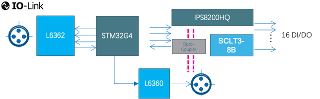 1、核心器件 IOLD-16DIO-R200:採用STM32G0+4*VNQ500+L6362+L6360 IOLD-16DIO-R300:採用STM32G4+2*IPS8200+2*SCLT3+L6362+L6360 2、IO-Link通信 協議版本: IO-Link V1.1.4 傳輸率: COM3= 230.4kBaud 最小通信周期: 0.4ms 過程數據長度: 2字節輸入/2字節輸出(非級聯模式)、4字節輸入/4字節輸出(級聯模式) 3、電氣參數 工作電壓:18-30VDC 開關電流:16x 350mA 傳感器總電流US:4A 執行器總電流UA:4A 最大靜態電流:≤50mA