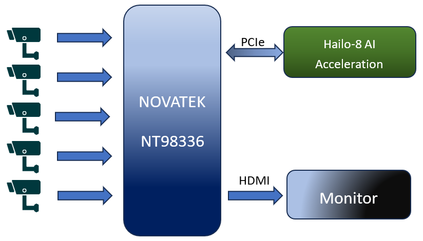 NT98336可透過 PCIe標準介面連接Hailo-8 AI Acceleration Module進行 AI 處理功能。