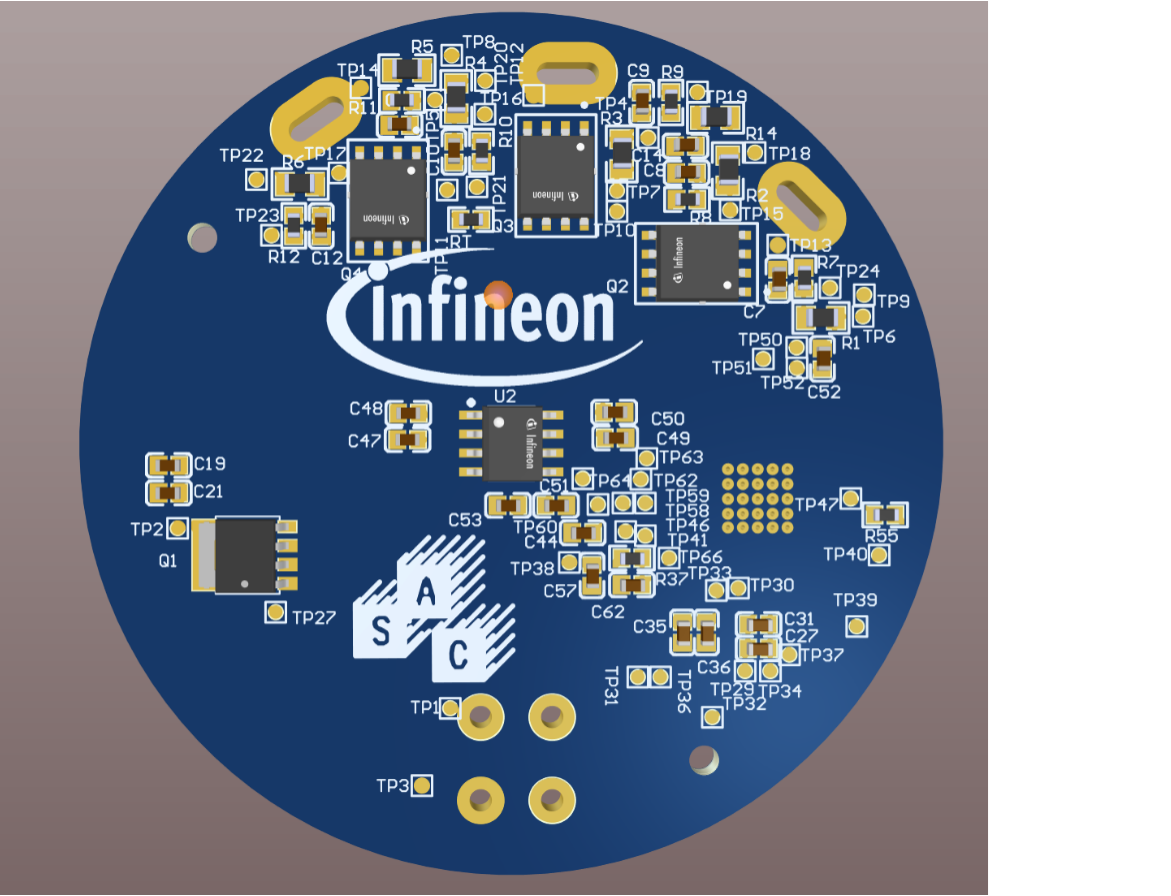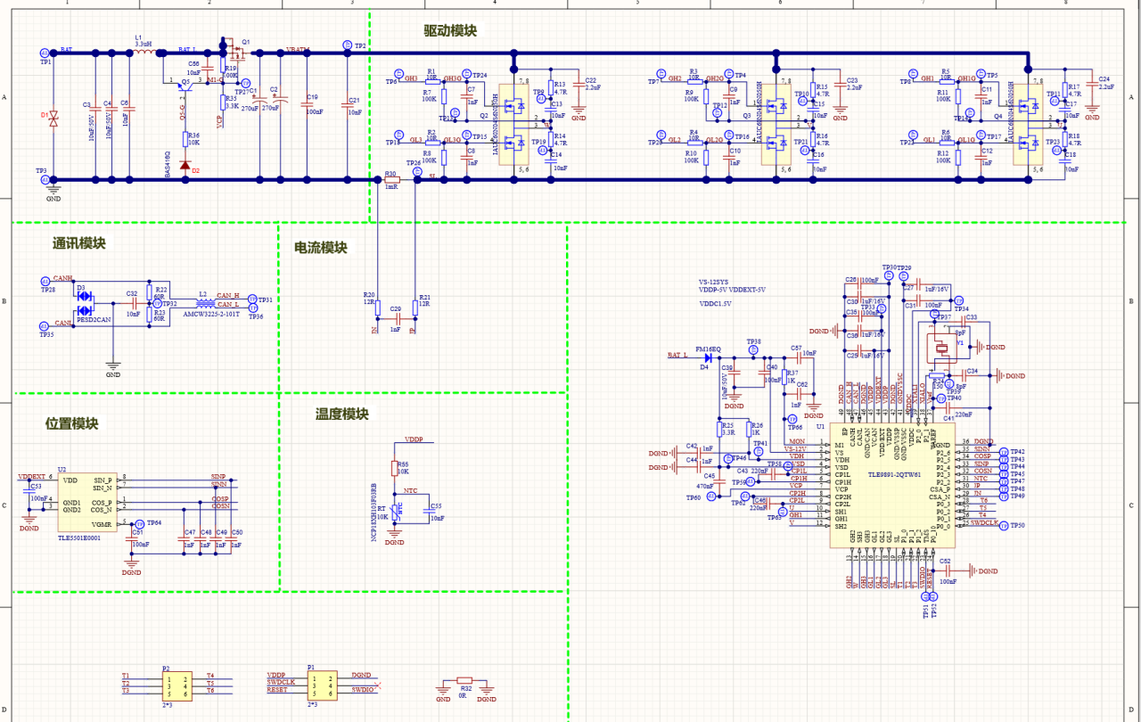 車規級TLE989X+TLE5501 Demo 開發板主要由輸入電源濾波電路(含防反功能),CAN通訊,TMR 傳感器TLE5501 ,逆變電路及晶片相關外圍硬體組成。其逆變部分由 3個型號為 IAUC60N04S6N050H 半橋 MOS 搭建,最大工作電壓可達 40V,最大工作電流可達60A。