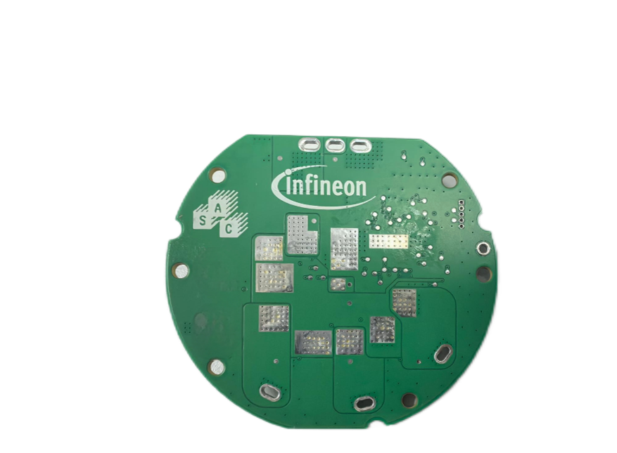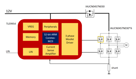 TLE9954 的開發板具有 LIN 通訊、電源防反及濾波電路、逆變電路及電流檢測組成,逆變部分由 6 個英飛凌最新的第 7 代產品 IAUCN04S7N030 MOS 組成,耐壓 40V。