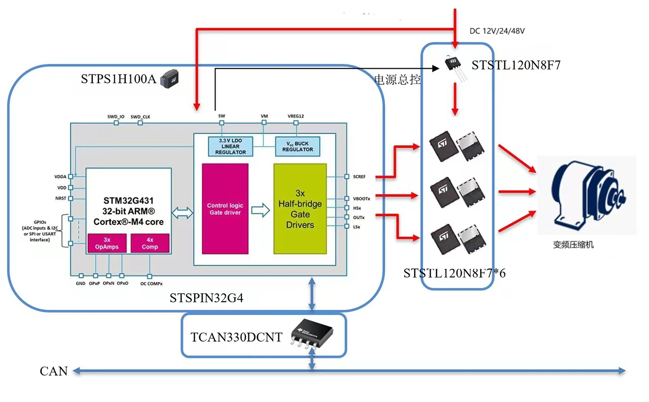 變頻駐車空調能根據車內溫度自動調整壓縮機轉速,從而精準控制製冷量。當車內溫度接近設定溫度時,壓縮機會降低轉速,以較低功率運行來維持溫度,避免了定頻空調頻繁啟停所造成的電能浪費。一般來說,變頻駐車空調可比定頻空調節能約30%至50%。變頻壓縮機驅動是變頻駐車空調的核心驅動技術。STSPIN32G4 是一個完整的馬達控制系統,結合了一個具有靈活電源管理部分的三相閘極驅動器以及一個 STM32G4 MCU。得益於其高整合度與靈活的設計,它為工業 4.0 以及日益普及的三相直流無刷馬達和電池供電系統催生的新應用,提供了最佳的馬達控制解決方案選擇。這款高性能的STSPIN32G4搭配6個功率MOS管後,您將擁有一個完整的變頻壓縮機控制系統,具備前所未有的靈活性,能完美兼容12V/24V/48V等不同的供電系統。