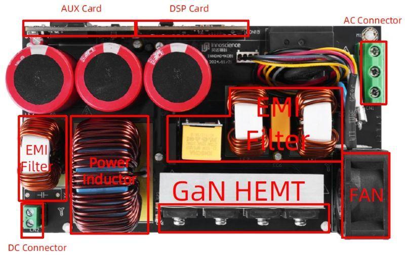 該方案內建4顆InnoGaN合封元件ISG6121TD,整個電源模組(不包括風扇和輔助電源)在整流230Vac測量的峰值效率為99.03%逆變測試峰值效率98.95%。