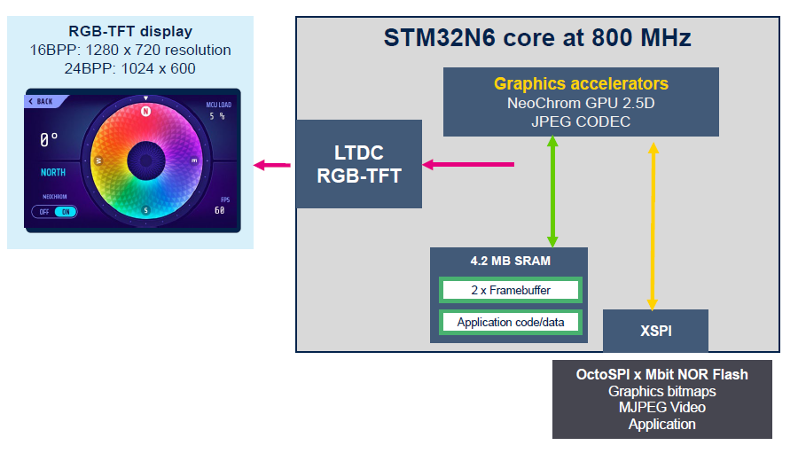 基於 Arm Cortex-M55 的微控制器,配備 ST 神經-ART 加速器、H264 編碼器、Neo-Chrom 2.5D 圖形處理器,4.2MB 連續型靜態隨機存取記憶體用於即時數據處理和多任務處理,專用嵌入式神經處理單元(600 GOPS NPU 和 3 TOPS/W 功耗),影像處理器 ISP(平行和 MIPI CSI-2 相機模組介面)支援 5 百萬像素相機和 30 FPS,具備壞像素修正、降採樣、黑電平校正、曝光調整、去馬賽克、列轉換、對比度調整、裁剪、縮小、伽馬值調整及像素打包功能。