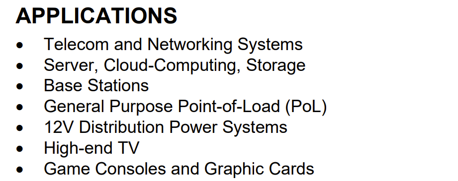 • 2.7V 的寬輸入電壓範圍: 1) 2.7V至16V,搭配外部3.3V VCC偏置 2) 4V至16V,搭配內部偏置或外部3.3V VCC偏置 • 支援差分輸出電壓遠端檢測 • 可調節的精準電流限制 • 12A輸出電流 • 低Rds(on)集成式功率MOS • 專有的開關損耗降低技術 • 自適應COT,實現超快瞬態響應 • 穩定使用零ESR輸出電容器 • 在0°C至70°C結溫範圍內提供0.5%參考電壓 • 在-40°C至125°C結溫範圍內提供1%參考電壓 • 可選擇Skip或Forced CCM工作模式 • 擁有卓越的負載調整率 • 電源故障期間PGOOD具備有源鉗位低電平功能 • 可編程軟啟動時間,從1毫秒開始 • 提供600kHz、800kHz和1000kHz的可選開關頻率 • 擁有Non-Latch OCP、UVP、UVLO、熱關閉及OVP的Latch-Off功能 • 輸出可在0.6V至90%*Vin範圍內調節,最高可達5.5V • 採用QFN 3mmx4mm封裝