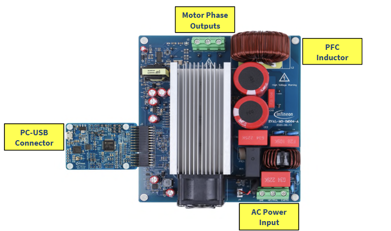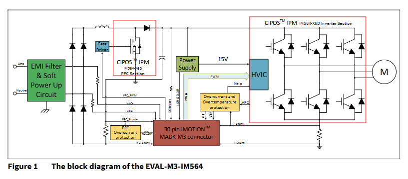EVAL-M3-IM564 旨在協助客戶初步設計使用 CIPOS™ Mini PFC 集成 IPM IM564-X6D/IM564-X6DS 的應用程式,並透過無感測器正弦控制運行任何永磁電機。