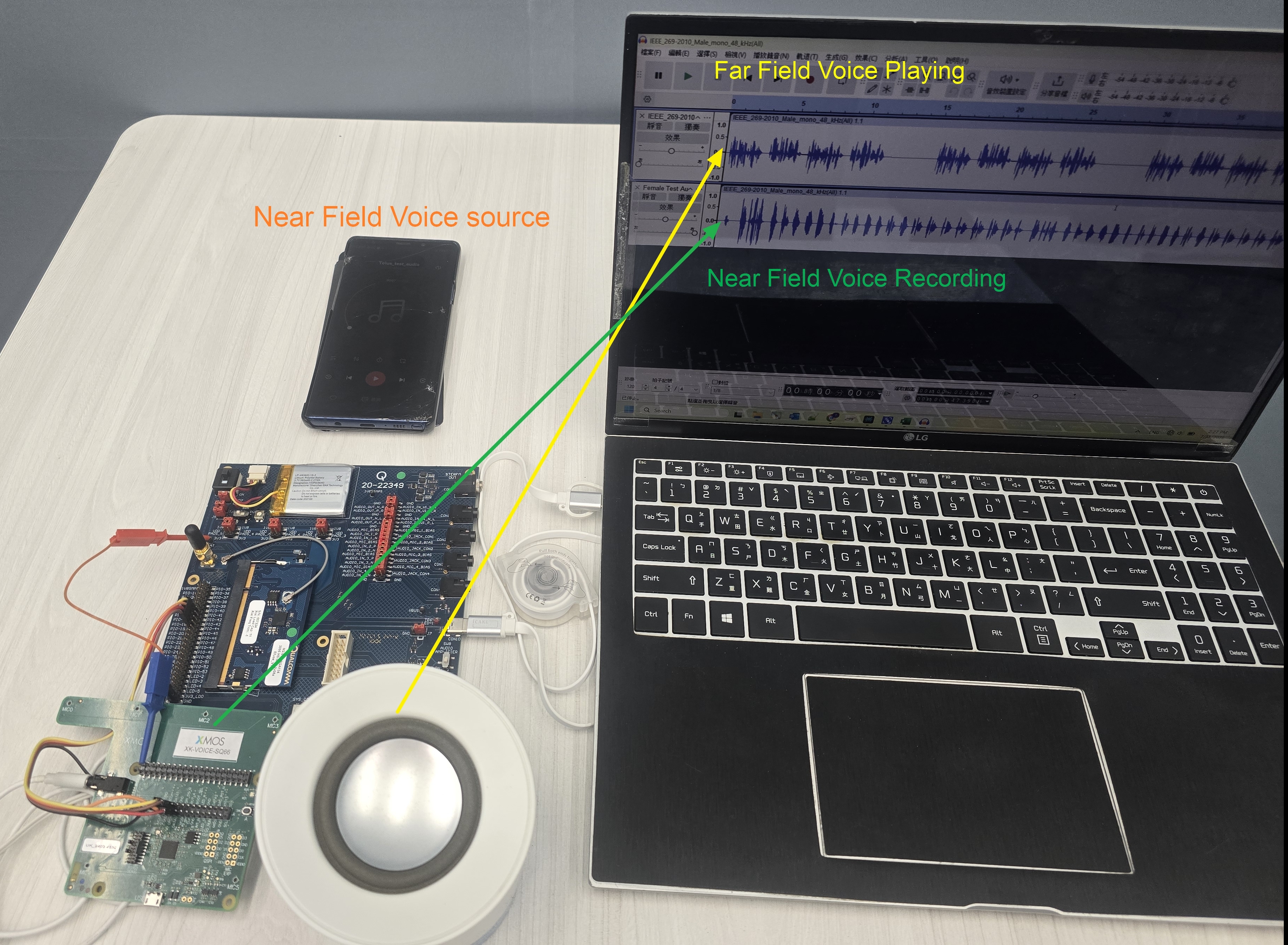 圖3是電腦上的音訊軟體用來模擬電腦會議的使用場景,分別播放遠端使用者的聲音(遠場聲音),另外再用手機播放人聲的音訊(近場聲音源),然後用電腦軟體錄製近端通過XVF3800陣列麥克風收音和處理後,通過QCC3095接收到的聲音進行錄製。