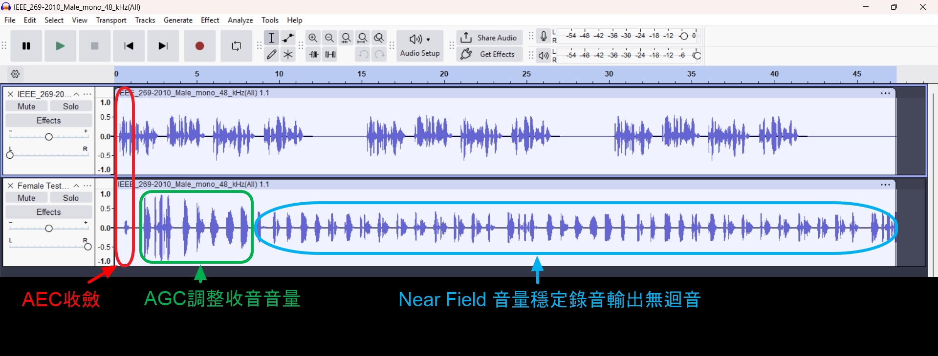 藍色框:標示「Near Field 音量穩定錄音輸出無回音」,經過XVF3800處理,透過QCC3095輸出的音頻既穩定又無明顯回音,收音品質較高,適合會議語音應用。