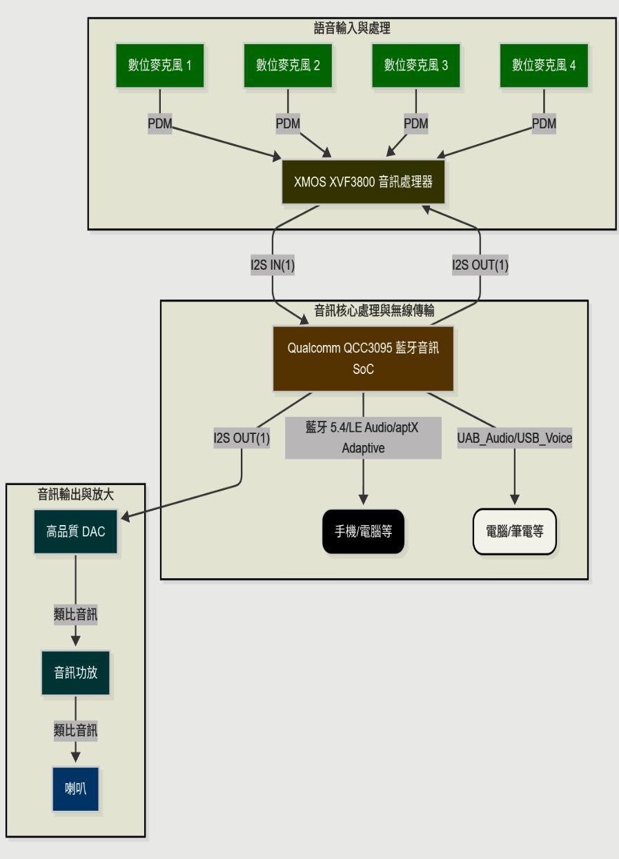 QCC3095 藍牙音訊 SoC • 無線標準:支援 Bluetooth 5.4、LE Audio、Auracast • 音訊格式:SBC、AAC、LC3、aptX Lossless、aptX Adaptive,最高支援24bit/96kHz • 內建 Kalimba DSP,支援高效能音訊解碼 • 功能管理:藍牙連接管理、音訊解碼、功耗控制 XMOS XVF3800 多核 DSP • 麥克風陣列:支援多達四顆陣列式麥克風,具備遠場拾音能力 • DSP演算法:波束成形(Beamforming)、自適應回音消除(AEC)、降噪、AGC自動增益控制 • 專業語音前處理:遠場語音辨識、自適應拾音降噪、雙向通話下增強語音清晰度
