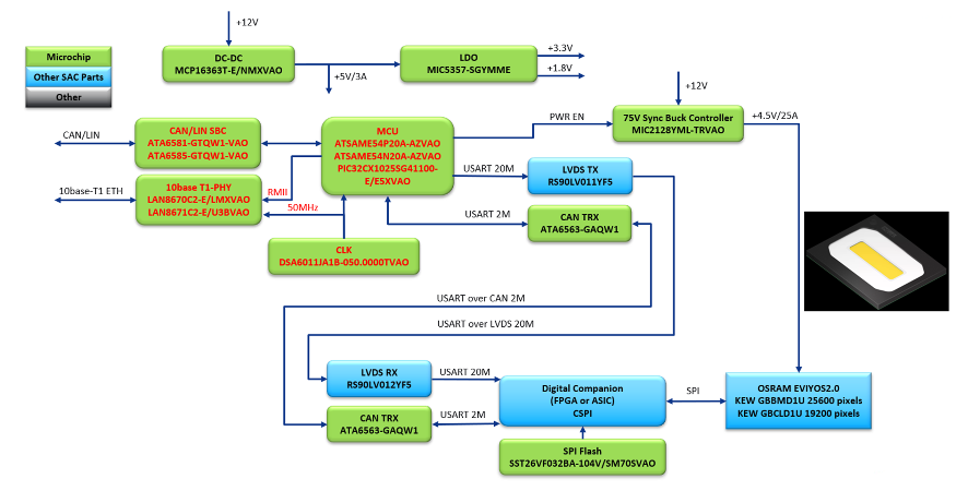 使用10BASE-T1S乙太網傳輸影片串流播放即時動畫,支援攝影機、影片檔案、電腦螢幕作為影片來源。 特性: • ATSAME54 32位元ARM Cortex-M4F高效能MCU運行FreeRTOS系統 • LAN8670 10BASE-T1S PHY乙太網即時影片串流傳輸實現靈活的動畫顯示 • 無需本地存儲影像和影片,無需OTA • 高速USART對EVIYOS進行配置和影片數據通訊 • 320x80=25600像素,30Hz刷新率 • MIC2128/MIC2132高壓大電流同步降壓電源 • LED溫度即時監測,TTS語音播報工作狀態。 目標應用: • 汽車投影頭燈 • ADB動態照明 • ADAS人車互動 • 車窗投影 • AR-HUD • 廣告燈 • 戶外廣告。