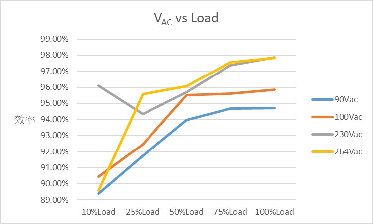 圖四,本案例在各輸入電壓對各負載條件下的效率表現