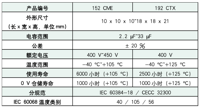 152 CME 和 192 CTX 系列電容的容量為 2.2µF 至 33µF,從 10mm x 10mm x 10mm 至 18mm x 18mm x 21mm 分為七種外形尺寸。電容器符合 RoHS 標準,防充放電,對峰值電流沒有限制,適合採用 JEDEC J-STD-020 規範無鉛(Pb)回流焊工藝,4 針和 6 針型號可防振。