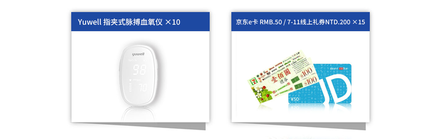 2. 京东e卡 RMB.50(大陆地区)或7-11线上礼券 NTD.200(台湾地区),共 15 份