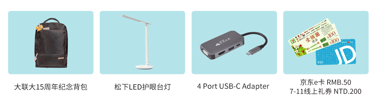 1. 松下LED护眼台灯(大陆地区)或大联大15周年纪念背包(台湾地区),共 1 份