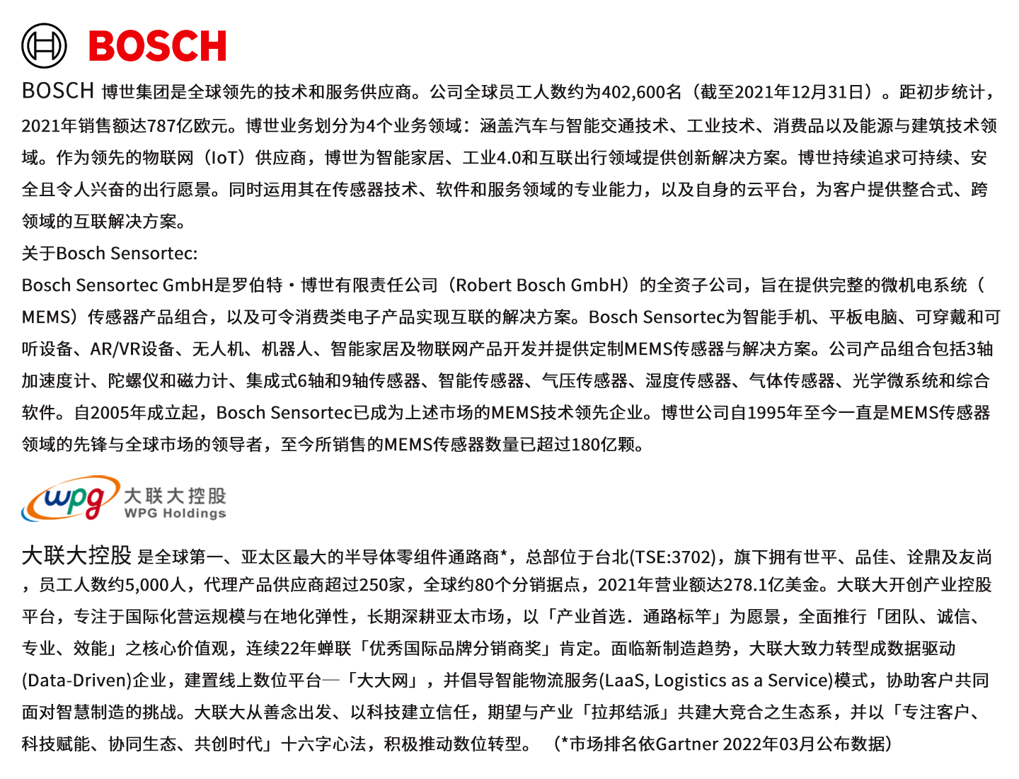 MEMS 传感器具有超小的体积, 超低功耗,高精度,反应时间快等众多优点,在IoT 物联网,智能家居,个人穿戴中有非常广泛的应用,特别是对于电池供电的便携式产品而言更加是不可或缺。 Bosch Sensortec 旨在提供完整的微机电系统(MEMS)传感器产品组合,以及可令消费类电子产品实现互联的解决方案,为智能手机、平板电脑、可穿戴和可听设备、AR/VR设备、无人机、机器人、智能家居及物联网产品开发并提供定制MEMS传感器与解决方案。Bosch Sensortec产品组合包括3轴加速度计、陀螺仪和磁力计、集成式6轴和9轴传感器、智能传感器、气压传感器、湿度传感器、气体传感器、光学微系统和综合软件。