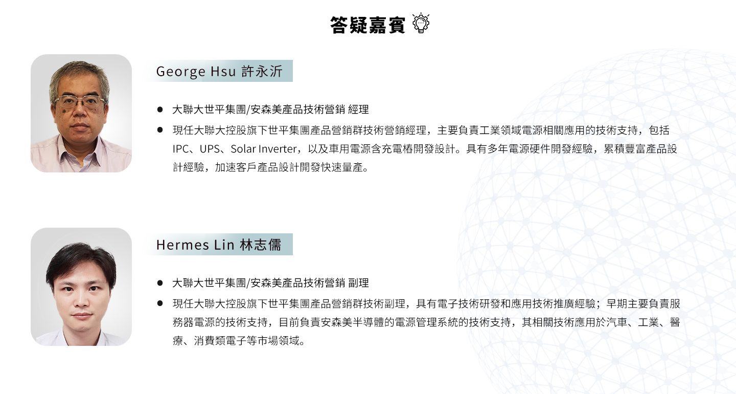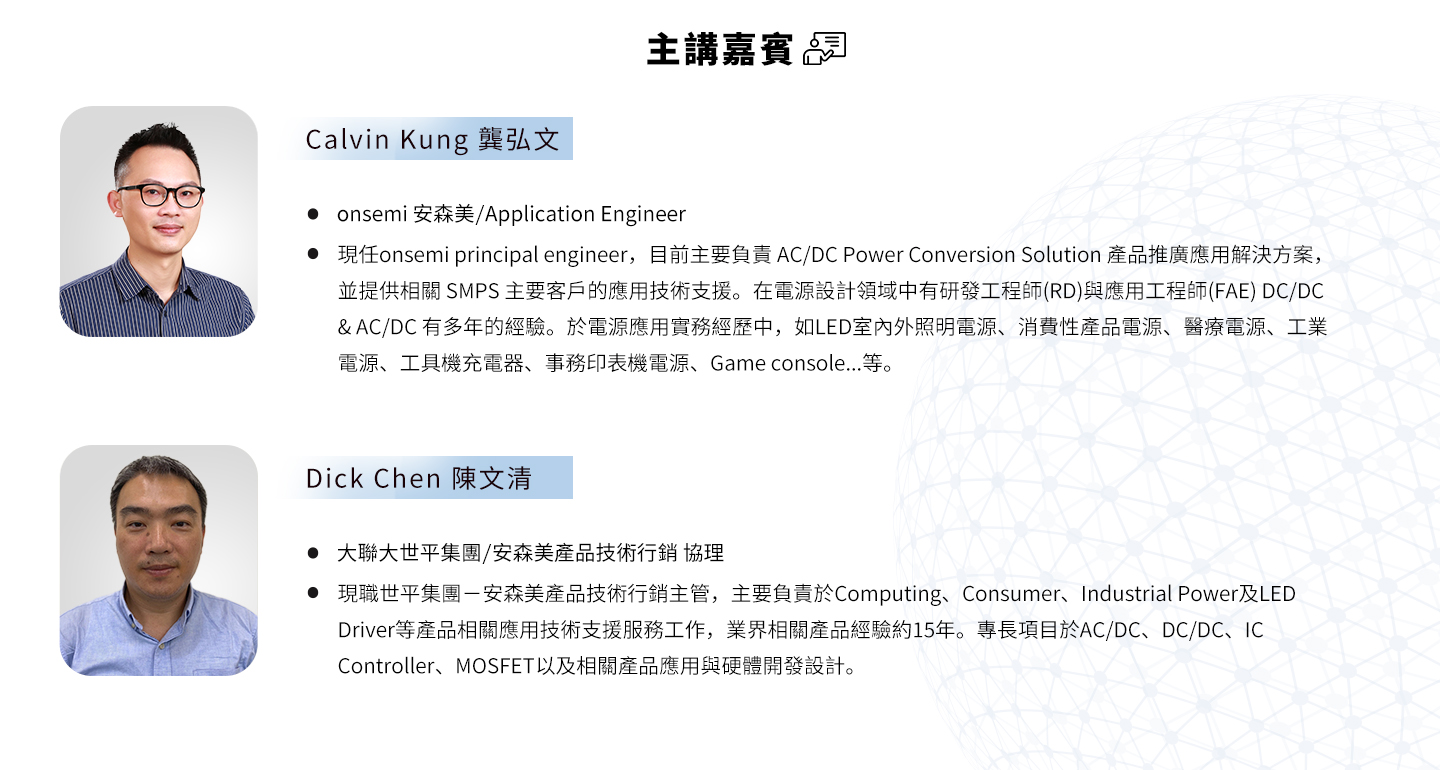 在這場研討會中,我們將會介紹 USB-PD 3.1 的規格以及安森美 (onsemi) PD 3.1 電源方案的設計與優化,會中也將為與會者提供一個交流和學習的平台,讓各位先進能了解最新的快充充電技術和趨勢,並與業界專家進行深入的討論和交流。期待您的參與!