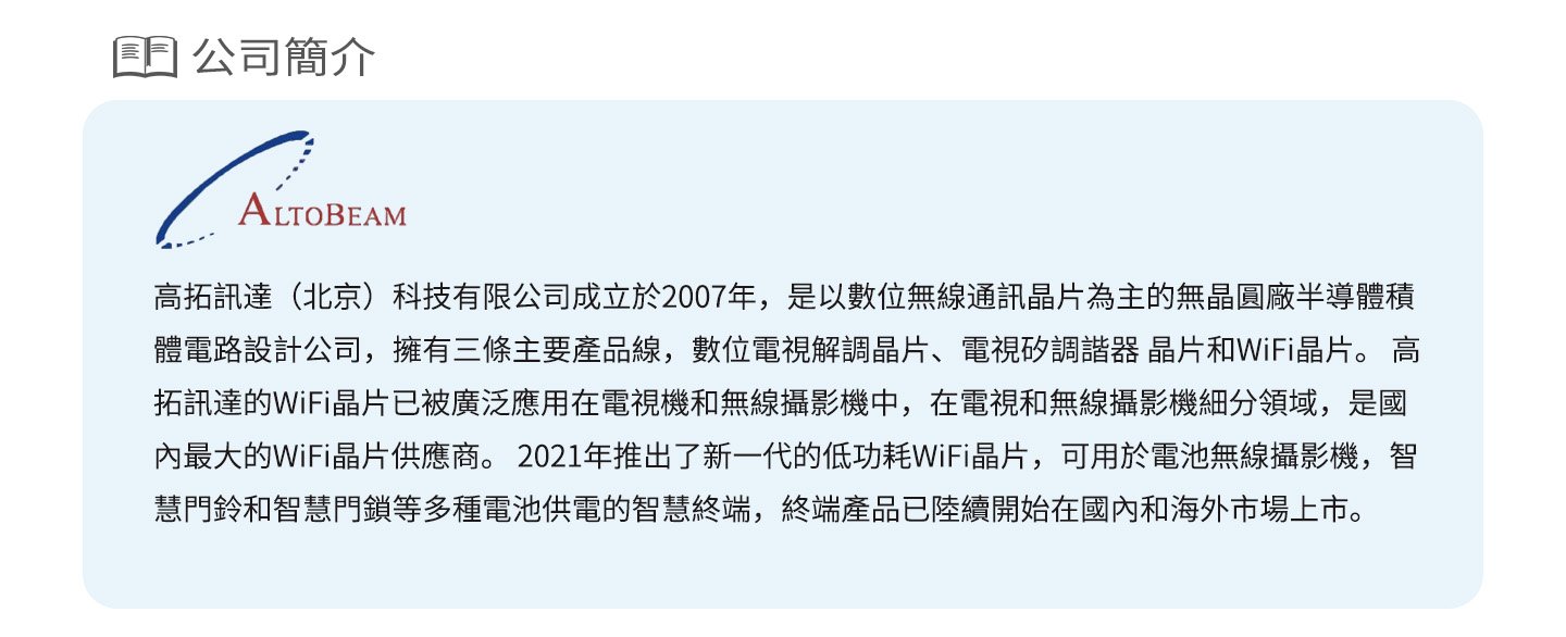 本次研討會,高拓訊達原廠介紹 Wi-Fi 6 傳輸芯片在安防監控領域的實際應用案例。希望通過這場研討會,正在進行研發長供電的智慧終端機的硬件、軟件、產品經理等行業夥伴,能更深入了解如何利用 Wi-Fi 技術優勢來設計長時間供電的智慧終端機。本次研討會的內容涵蓋了智慧攝像機、嬰兒監視器、智能套機、機上盒、行車記錄儀等多個應用場景。高拓訊達下半年最新推出雙頻 Wi-Fi 4 ,它們的核心技術優勢都包括完整 Wi-Fi 6 協議、橋接功能、雙 AP 模式、雙 STA 模式、特殊頻點、BLE 配網、藍牙遙控器等,滿滿乾貨,等您來參加!
