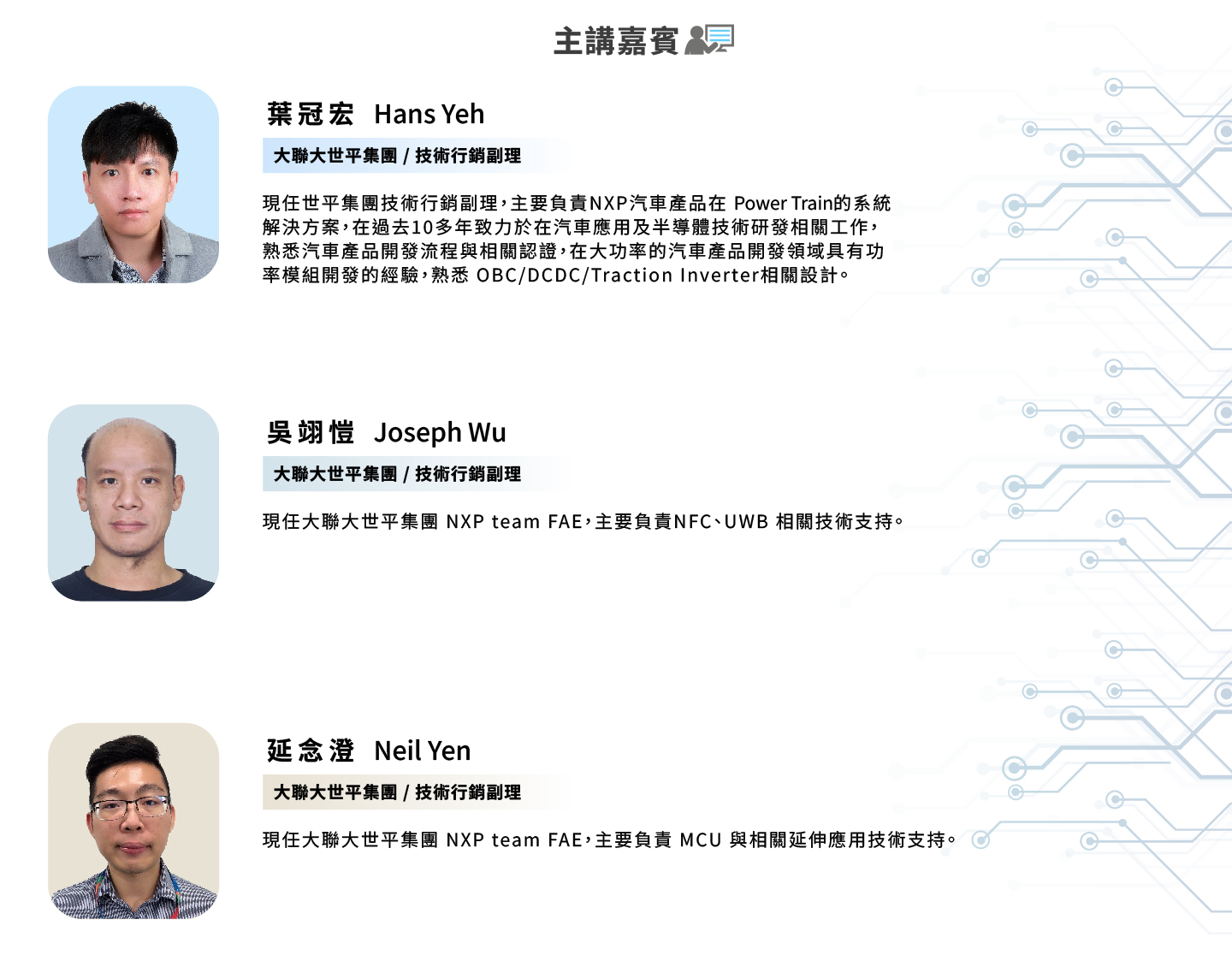 在汽車技術不斷進步的今天,智能化已成為汽車行業發展的主要趨勢之一。本次研討會將深入探討NXP的Smart Access Car技術,說明如何通過NXP 產品設計提升汽車的安全性、便利性和使用者體驗。研討會將涵蓋NXP MCU/NFC等方面的最新解決方案,並探討這些技術如何改變未來汽車的設計和應用。