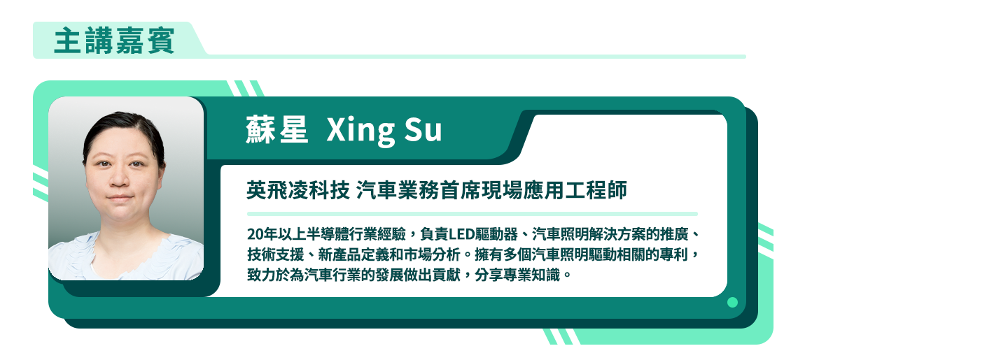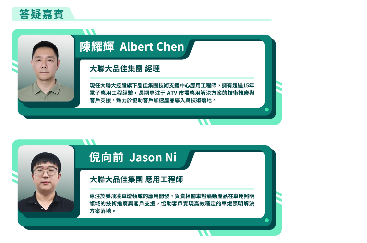 大聯大品佳集團特別邀請英飛凌原廠專家,親自線上深度解析新一代汽車內飾燈驅動方案,揭示如何運用創新組件與整合技術,打造兼具美學與效能的智慧氛圍燈設計。您將全面瞭解從控制 IC 選型、驅動架構建置,到系統整合建議等完整技術規劃,助您加速開發進程、降低導入風險。