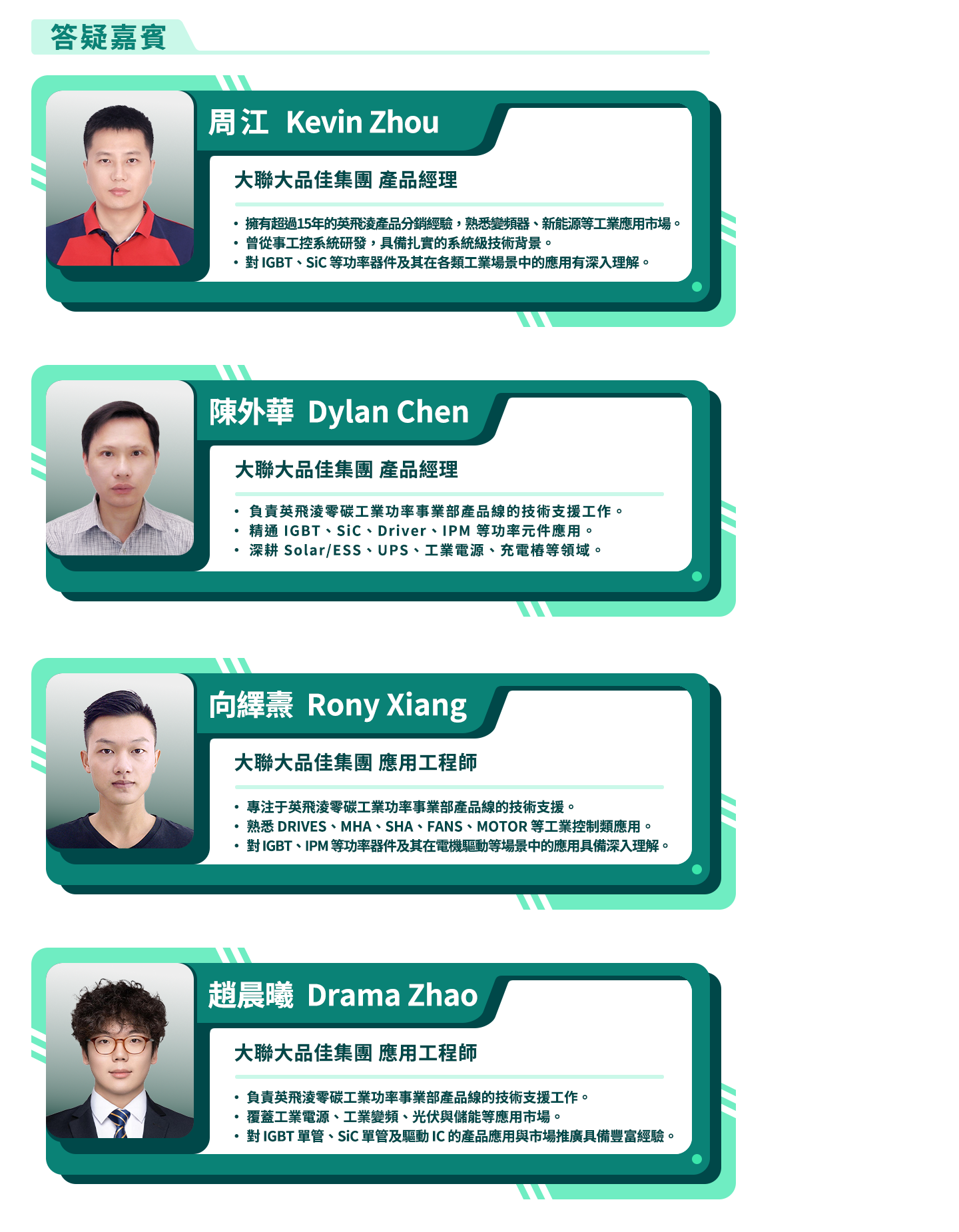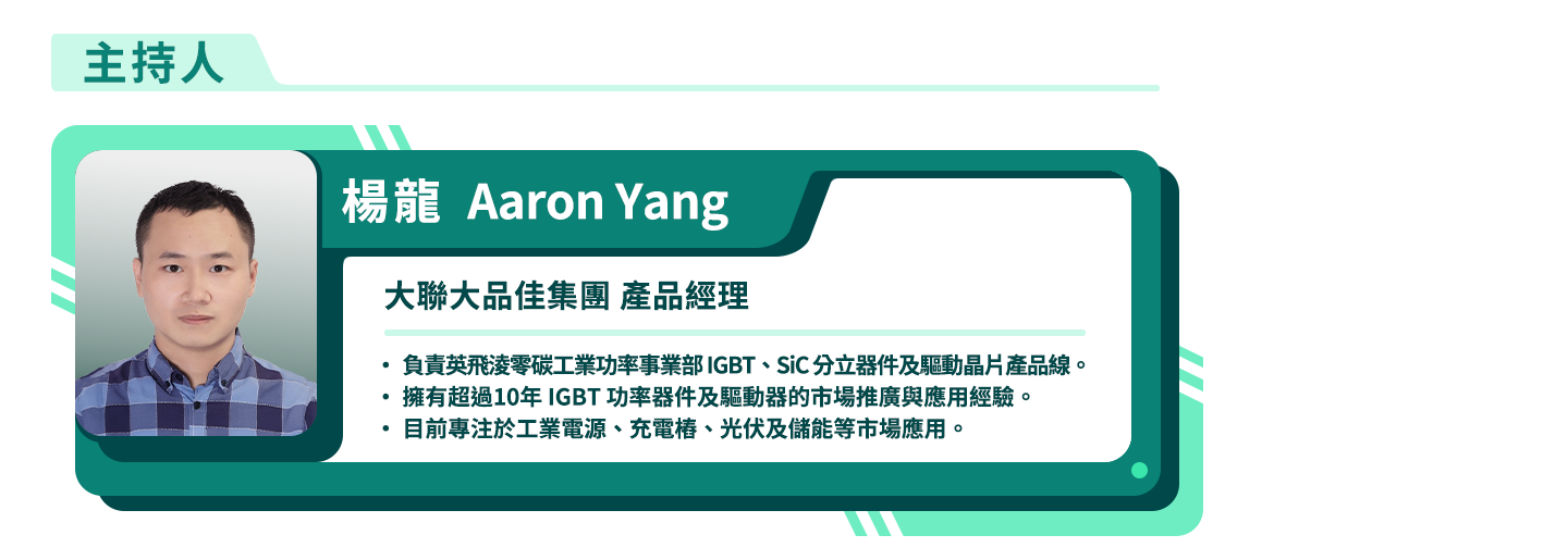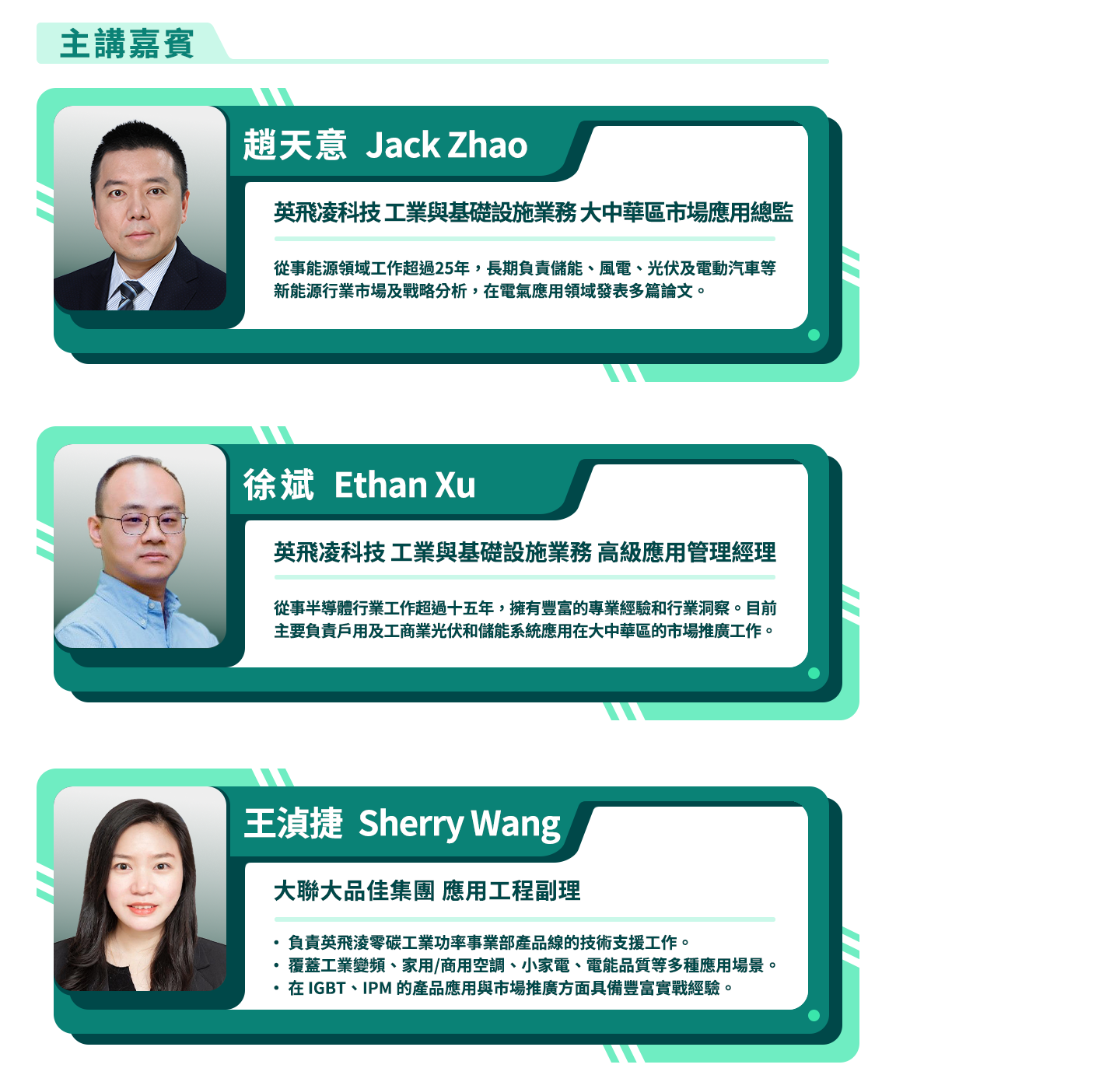 本次研討會將由英飛凌市場應用總監與應用管理經理聯合主講,聚焦光伏與儲能系統的技術趨勢,深入解析英飛凌一站式解決方案,並由品佳應用工程副理分享實際應用案例,協助客戶掌握未來技術方向與最佳解決路徑。
