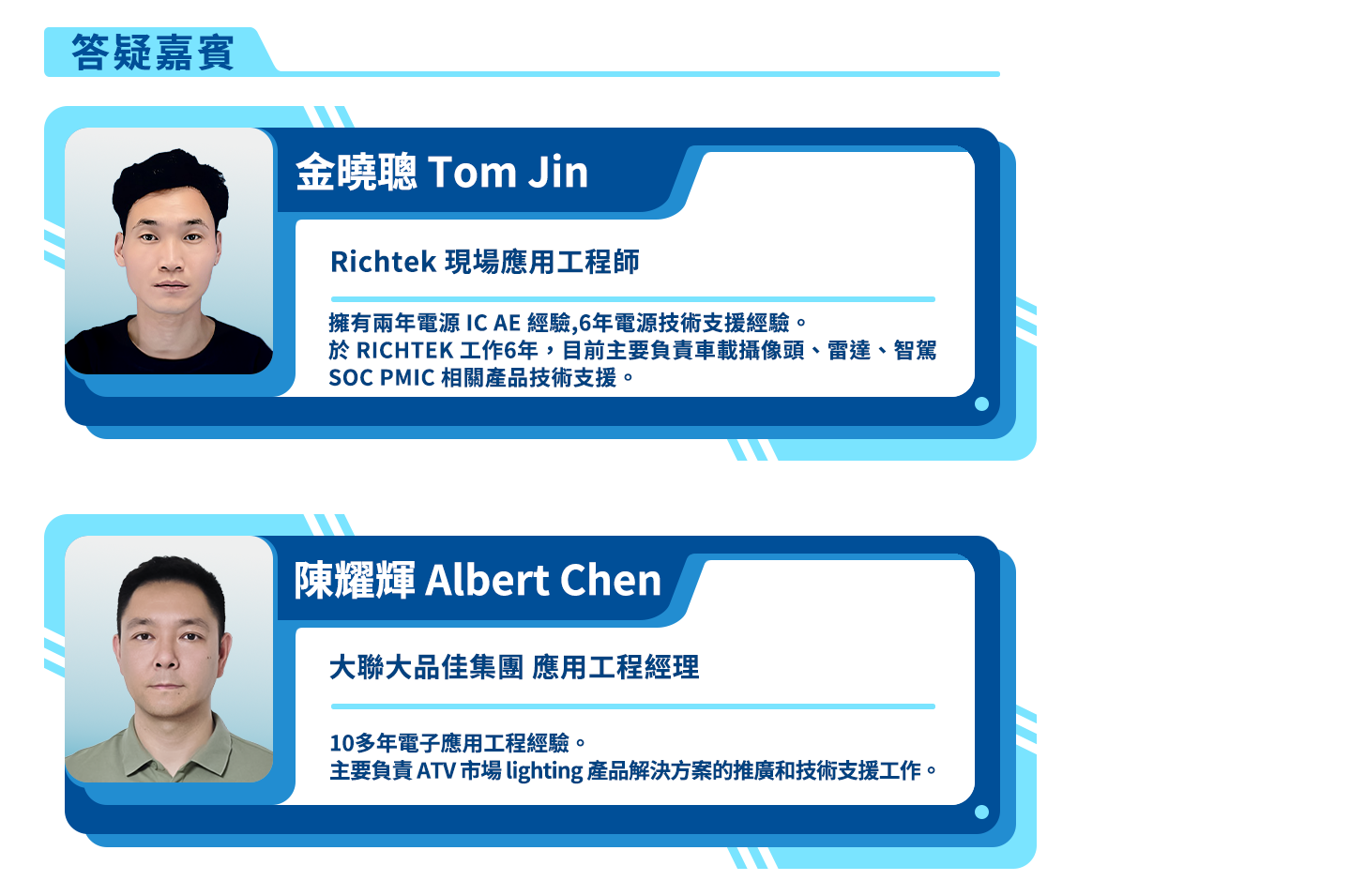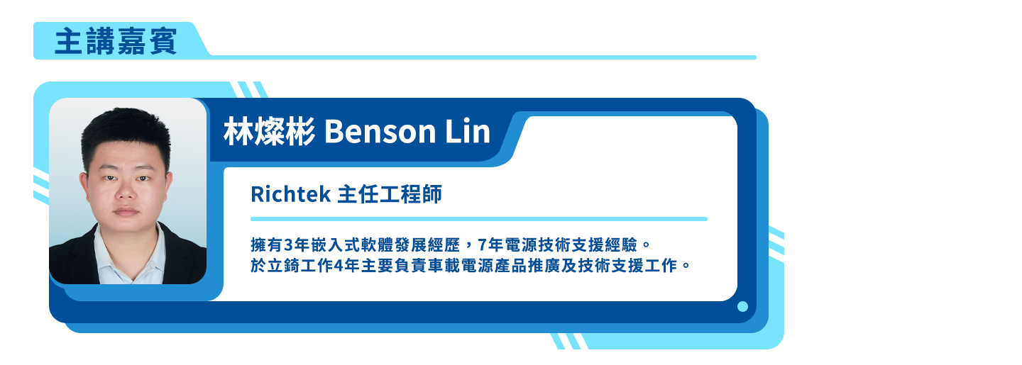 本次研討會特邀 Richtek 技術專家 Benson將深入解析車載電源設計的關鍵技術方向,並現場分享多款適用于智慧座艙與ADAS的電源方案,幫助工程師與研發團隊掌握高集成設計在系統安全與性能優化中的應用實踐。